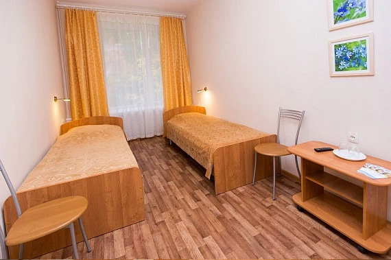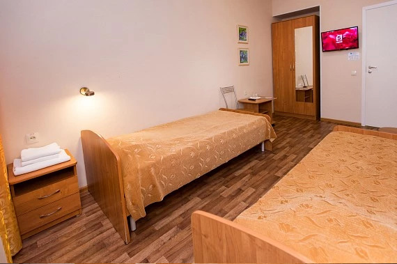 2 осн. места. 1 доп. место. Балкон. Мебель: вешалка, зеркало, кровати односпальные, прикроватные тумбочки, стол, стулья, шкаф. Оборудование. Санузел и душевые на этаже. Сервис: смена полотенец, смена постельного белья, уборка номера.
