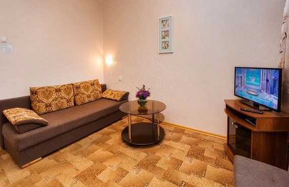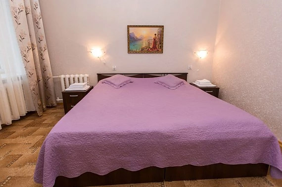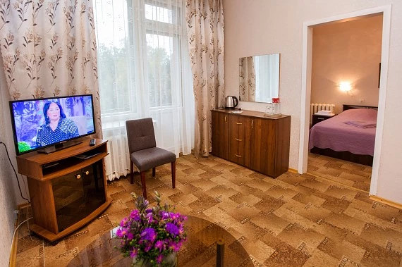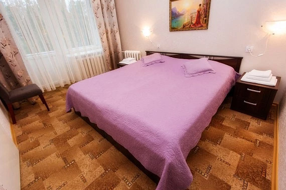 Площадь номера - 22,9 кв.м. 2 осн. места. 1 доп. место. Мебель: диван, зеркало, кровати односпальные /одна двуспальная кровать, прикроватные тумбочки, стол, стулья, шкаф. Оборудование: мини-холодильник, телевизор, чайный набор посуды, электрочайник. Санузел: с душем, туалетные принадлежности, фен, халат. Сервис: смена полотенец, смена постельного белья, уборка номера.