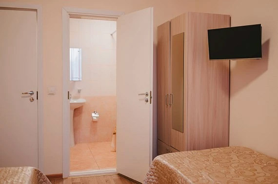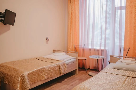 Площадь номера - 12 кв.м. 2 осн. места. 1 доп. место. Балкон. Мебель: вешалка, зеркало, кровати односпальные, прикроватные тумбочки, стол, стулья, шкаф. Оборудование: телевизор, холодильник (общий на 2 номера). Санузел: с душем, туалетные принадлежности. Сервис: смена полотенец, смена постельного белья, уборка номера.